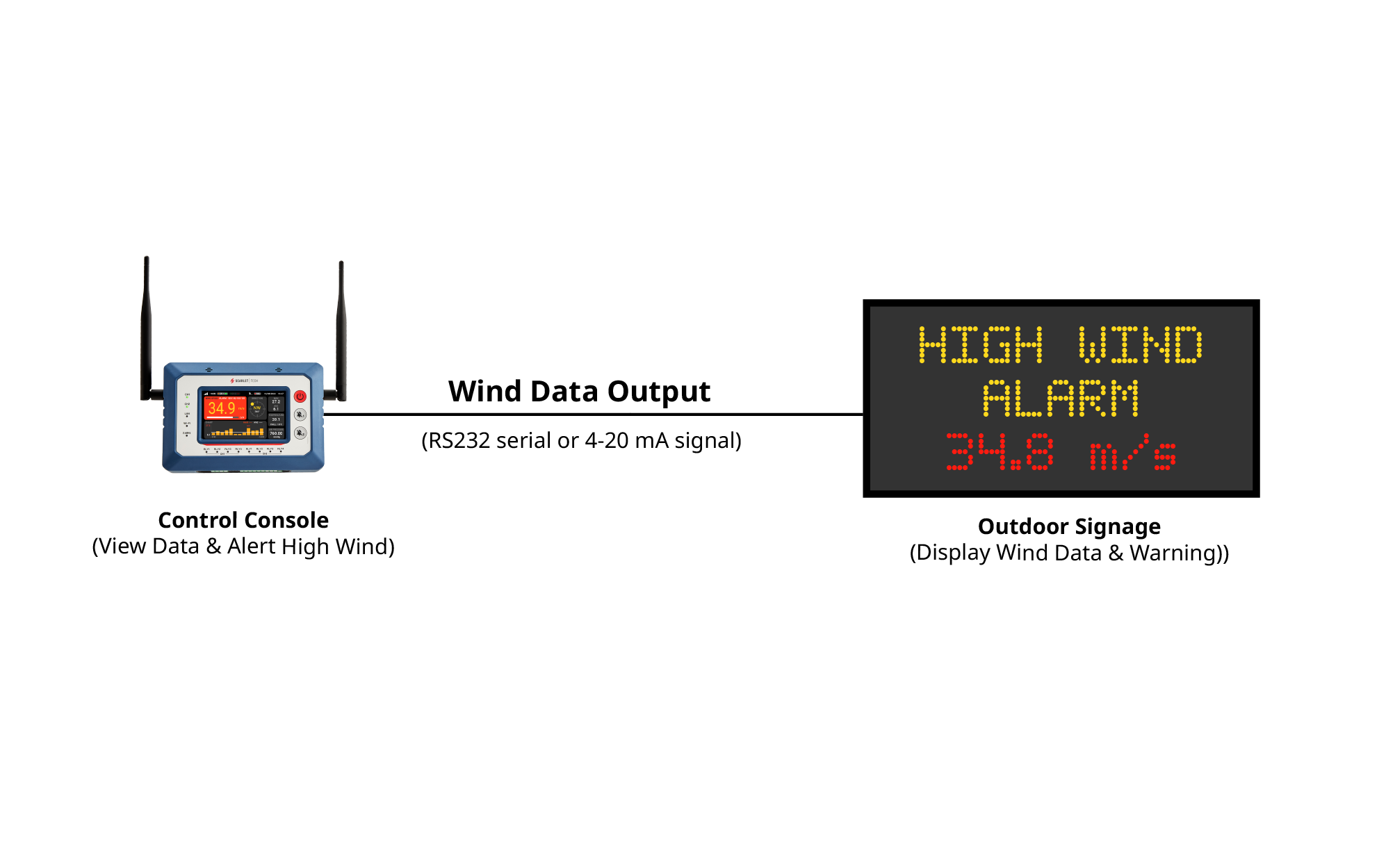 Seamlessly display wind data on large LED signage or integrate with field systems via RS232 serial or 4–20 mA analog signals.